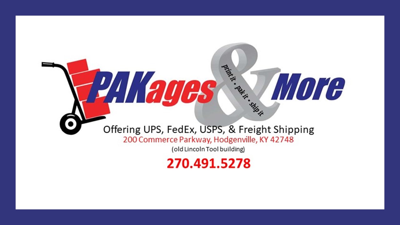 PAKages & More LLC in Printing & Copying Services, Retail/Service, Shipping Services UPS, FedEx, USPS, Freight Shipping, Printing & Copying. 2704915278 [email protected] 200Commerce Pkwy Hodgenville, KY 42748
